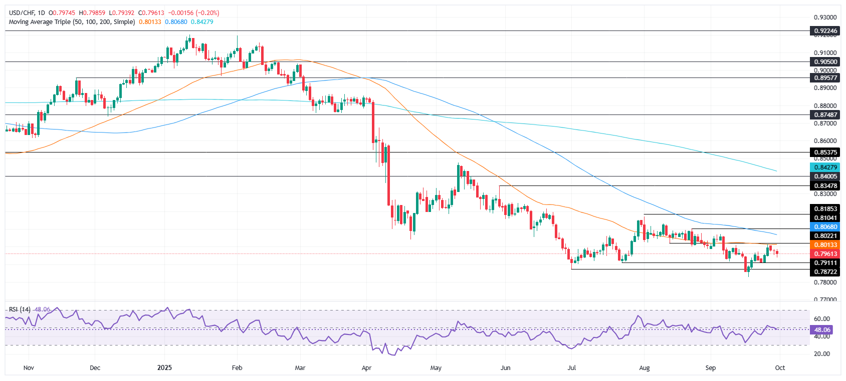 01 10月 2025 10:10 美元/瑞郎在20日简单移动均线(SMA)附近盘整,当前位于0.7955,较前一交易日下跌0.05%,随着周三亚太时段的开始,技术面显示该货币对可能在当前水平附近触底,尽管在9月中旬刷新了0.7829的年内低点。
