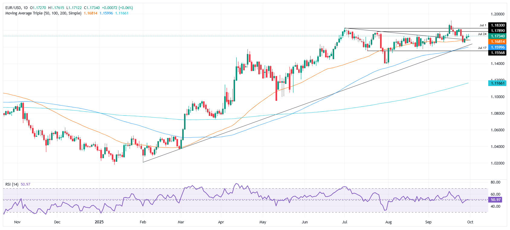 01 10月 2025 10:10 欧元/美元在周二的北美时段保持坚挺,尽管由于可能的政府关门担忧,美元走弱,这可能会干扰美联储官员发布关键就业数据的进程。在撰写本文时,该货币对交易于1.1735,微涨0.05%