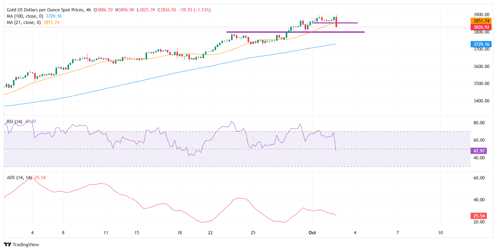 03 10月 2025 00:10 黄金(黄金/美元)周四走势偏向看跌,在周三创下近3895美元的新历史高点后,削减了近期的涨幅。撰写时,黄金/美元在美国时段交投于3820美元附近,较纪录高点回落超过1.0%。