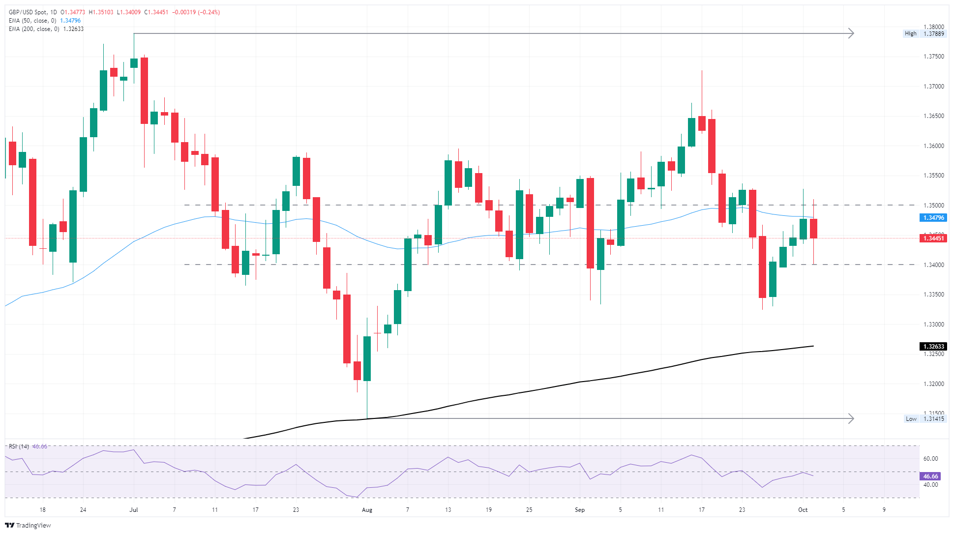 03 10月 2025 10:10 英镑/美元在周四回落,结束了四个交易日的上涨势头,并从1.3500关口的技术性拒绝中大幅下跌。英镑/美元正在从1.3400到1.3500的中期整合中回落,价格走势顽固地保持在50日指数移动均线下方。市场在动能上延长了暂停,投资者在权衡美国政府的联邦停摆将持续多久以及可能产生的经济影响。