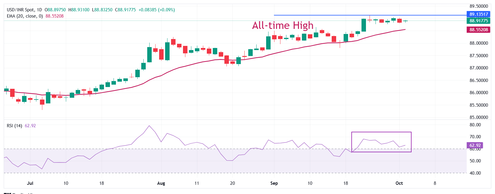 印度卢比(INR)在周五印度交易时段尾盘继续在88.90附近平稳交投。尽管如此,美元/印度卢比接近上周创下的约89.12的历史高点