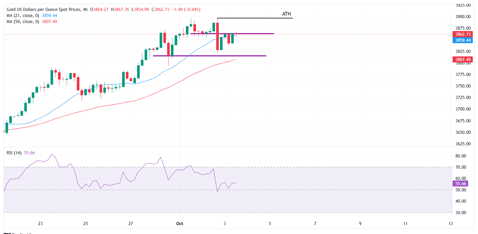 04 10月 2025 00:10 黄金(黄金/美元)在周五上涨至3850美元上方,在美国交易时段交投于3875美元附近,日内上涨近0.50%。该金属已从接近3838美元的日内低点反弹,随着美元(USD)在周四小幅反弹后回落,重新获得买盘。