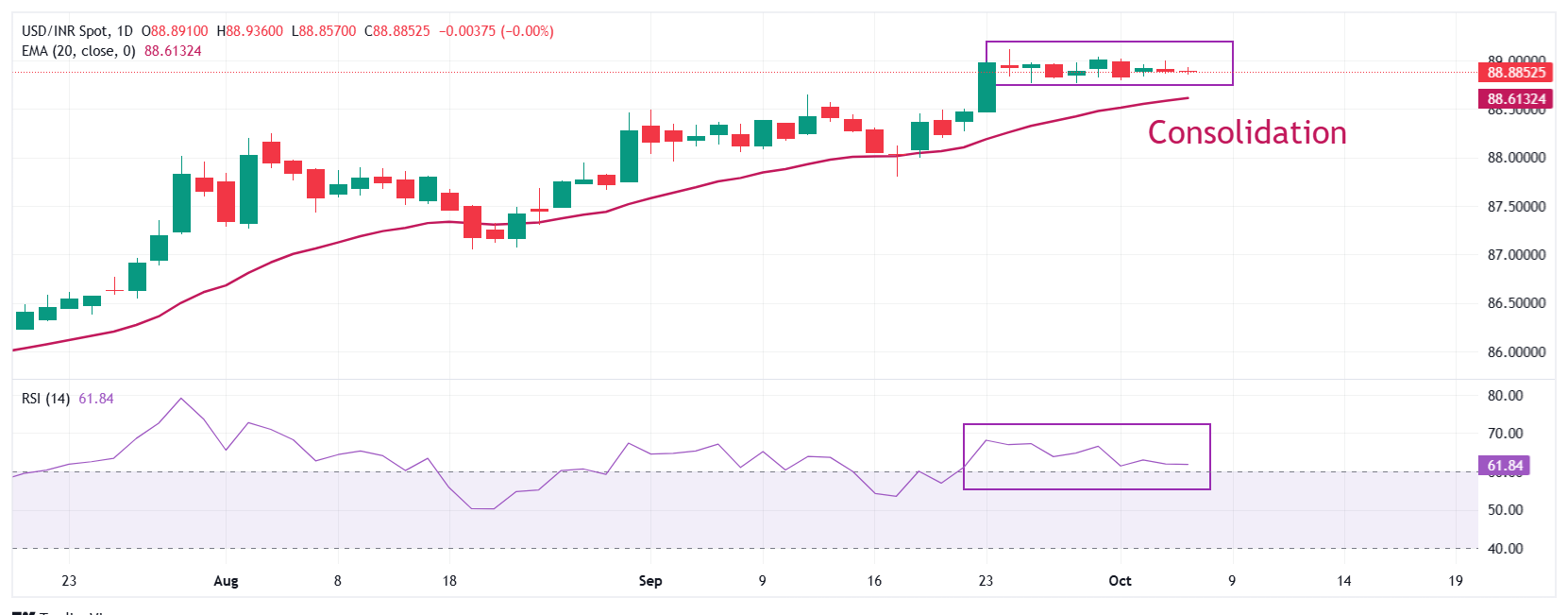 07 10月 2025 20:10 印度卢比(INR)在周二对美元(USD)徘徊于88.90附近。美元/印度卢比(USD/INR)货币对在接近89.10的历史高位附近延续其横盘趋势,已连续第10个交易日,投资者在美印之间持续的贸易紧张局势中保持谨慎。