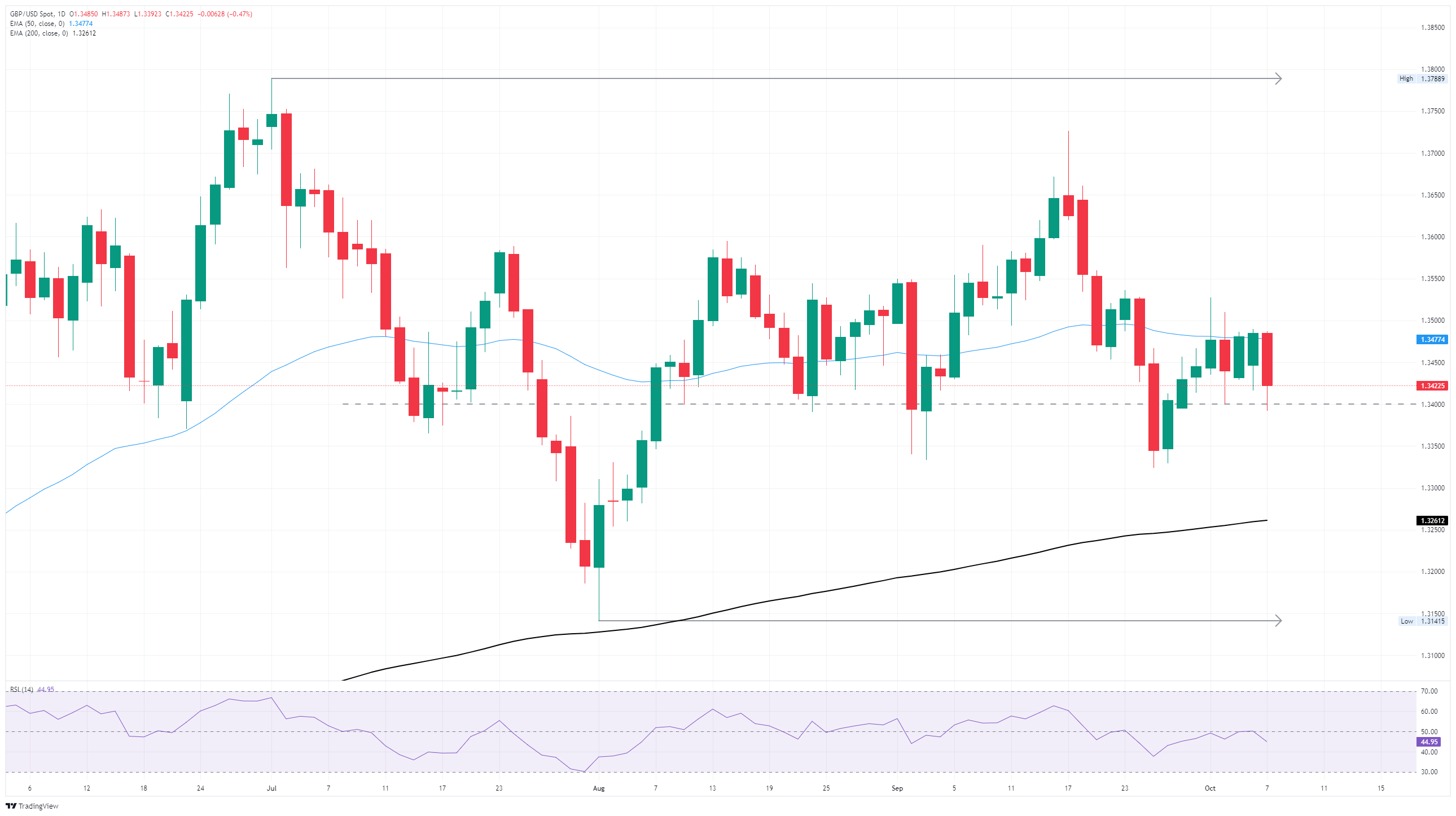 英镑/美元在周二的北美时段下跌,此前未能突破 1.3464 的 50 日简单移动均线 (SMA),而美国政府持续停摆使得美元录得上涨。