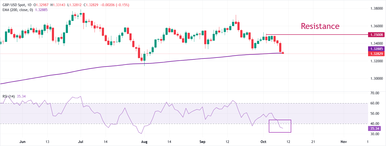 10 10月 2025 20:10 英镑(GBP)在周五的欧洲交易时段努力对抗美元(USD),此前在当天早些时候创下了1.3280附近的两个月新低。由于美元坚挺,且在日本和法国的政治发展后其避险需求增加,GBP/USD的前景仍然脆弱。