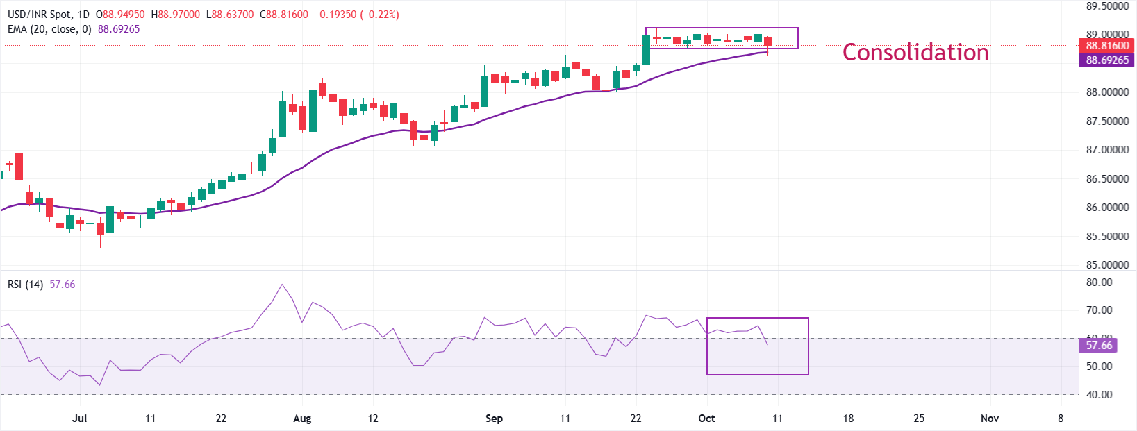 10 10月 2025 20:10 在周五印度下午交易时段,印度卢比(INR)对美元(USD)吸引了大量买盘。美元/印度卢比汇率急剧回落至88.74附近,尽管美元交易坚挺,这表明印度卢比的强劲。该汇率已滑落至其超过两周的区间88.75-89.10的下边界附近。