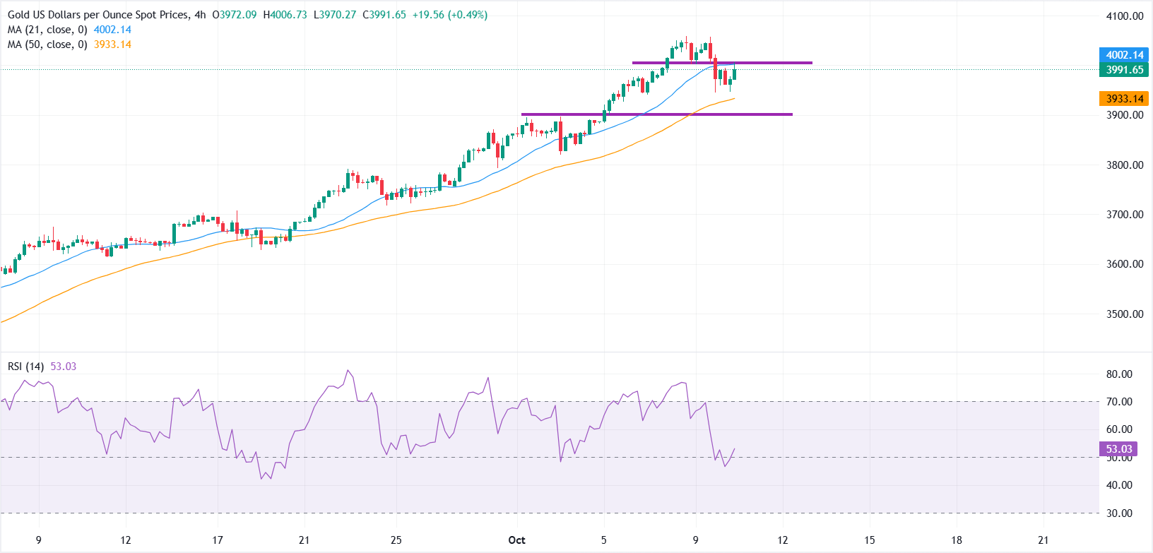 11 10月 2025 00:10 黄金(黄金/美元)在周五保持坚挺,此前在周四经历了大幅回调,重新测试了周三的历史高点4059美元。截至发稿时,黄金/美元在3985美元附近徘徊,牛市在4000美元的心理关口上方延续涨势的努力面临挑战。