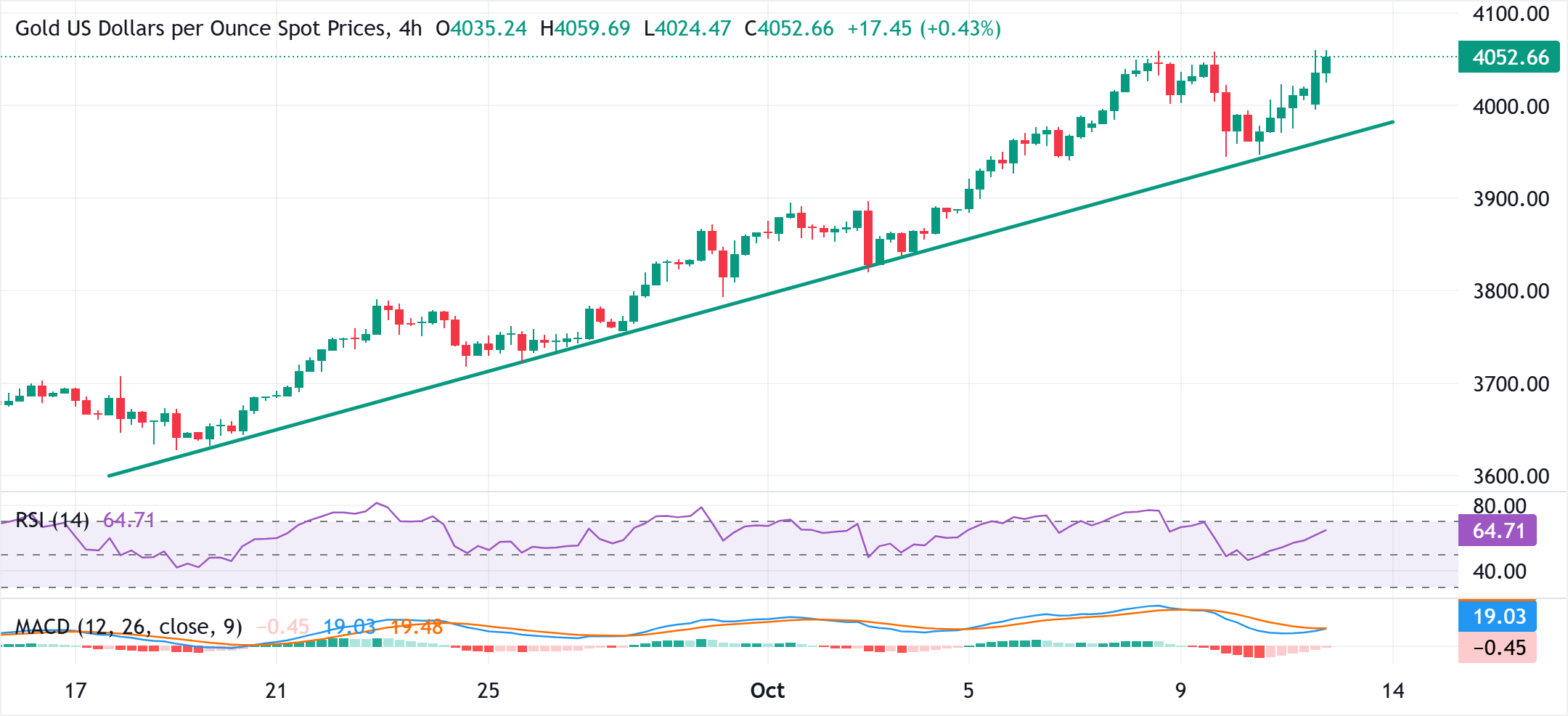 13 10月 2025 20:10 黄金(XAU/USD)在周一欧洲时段的前半段稳固于历史高点附近,并似乎在支持性基本面背景下有进一步升值的潜力。投资者现在似乎担心美国政府的长期停摆将影响经济表现。此外,来自持续的俄罗斯-乌克兰战争的地缘政治风险和新一轮的美中贸易紧张局势推动避险贵金属连续第二天上涨。