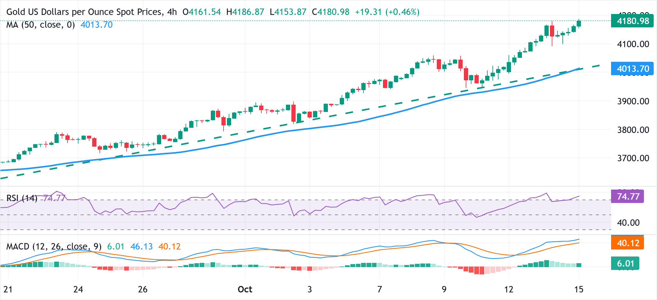 15 10月 2025 20:10 黄金(黄金/美元)在周三欧洲时段的前半段突破4200美元大关,并继续创下新的历史高点,背后有支持的基本面背景。在地缘政治紧张局势的背景下,美中贸易冲突的进一步升级成为支撑这一避险贵金属的关键因素,市场对美国政府可能长期停摆的担忧加剧。此外,鸽派的美联储(Fed)预期也促使资金流向这一无收益的黄色金属。