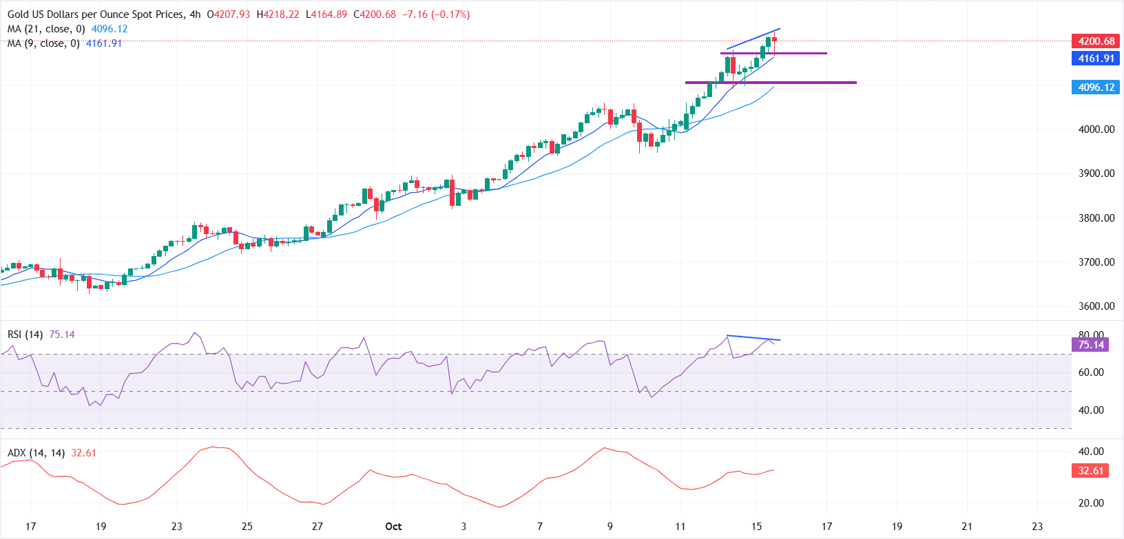 16 10月 2025 00:10 黄金(XAU/USD)在周三继续创下纪录,突破4200美元,因强劲的避险资金流入保持需求高涨。这种黄色金属几乎每天都在创下新高,受到持续的全球经济和政治不确定性以及对美联储(Fed)温和立场的日益预期的支撑。