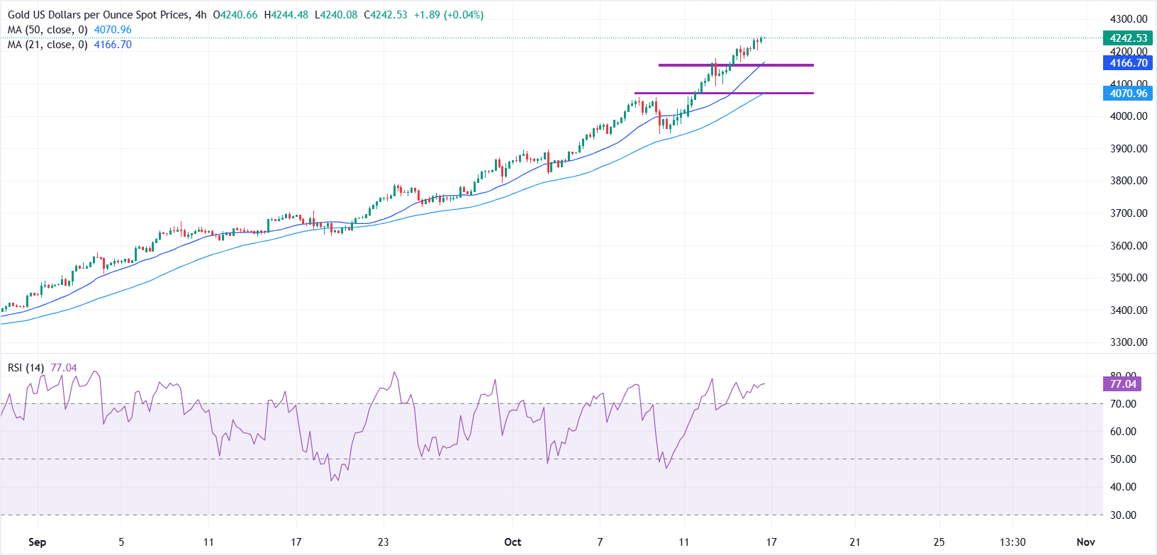17 10月 2025 00:10 黄金(XAU/USD)周四再次飙升至创纪录的新高,深入未知领域,避险需求在日益加剧的地缘政治和经济不确定性中依然强劲。截至撰写时,黄金/美元交易价格约为4253美元,本月迄今上涨近10%,年初至今上涨超过60%。