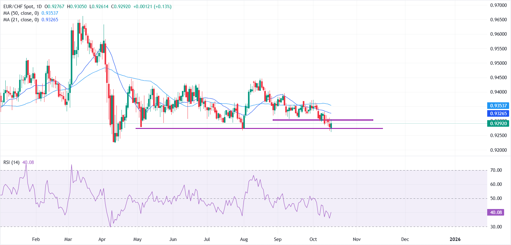 17 10月 2025 00:10 周四,欧元(EUR)对瑞士法郎(CHF)走强,欧元/瑞郎在当天早些时候短暂跌至4月17日以来的最低水平后,结束了四天的下跌趋势。截至撰写时,该货币对交易于0.9290附近,保持坚挺,买家在突破0.9300心理关口方面面临挑战。