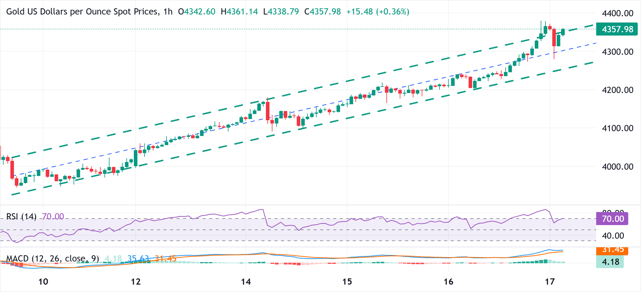 17 10月 2025 20:10 黄金(黄金/美元)在周五经历了良好的双向价格波动后趋于稳定,目前在欧洲时段的前半段交投于4350美元下方。然而,该商品仍有望连续第九周录得强劲涨幅,并可能在支持性基本面背景下延续近期创纪录的涨势。由于美国与中国之间贸易紧张局势的重新升级、地缘政治不确定性以及美国政府长期停摆带来的经济风险,投资者情绪受到压制,这继续为避险贵金属提供助力。
