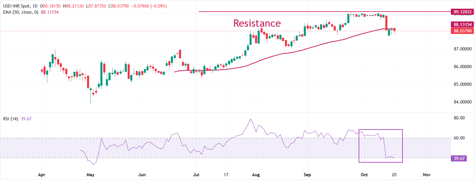 美元/印度卢比在周一的交易中几乎损失了0.1%,收于接近88.00。周二,由于排灯节拉克希米普贾,印度市场休市,周三也因巴利普拉提帕达而休市。