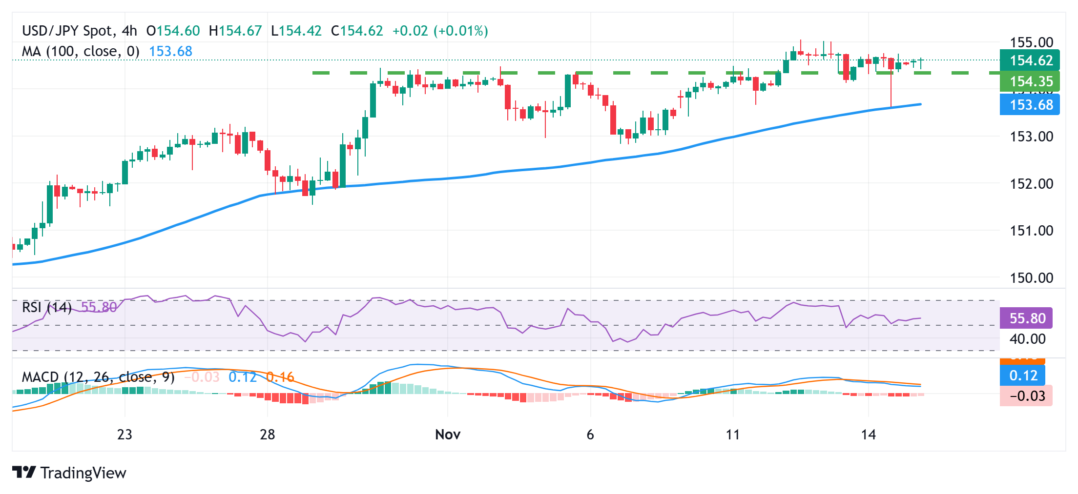 日本央行(JPY)在周一早盘的欧洲时段中,面对普遍走强的美元(USD)保持其卖盘基调,并接近上周触及的九个月低点。今天早些时候发布的政府数据显示,日本经济在7月至9月期间首次出现六个季度的收缩。这是在日本首相高市早苗的财政刺激计划和对超宽松货币政策的支持背景下,削弱了市场对日本央行(BoJ)加息的押注,并削弱了日元(JPY)。另一方面,美元受益于市场对美联储(Fed)在12月再次降息的押注减少,帮助美元/日元(USD/JPY)维持在154.45-154.50的阻力区上方。