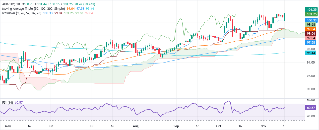 澳元/日元在周一录得0.17%的跌幅后反弹,涨幅为0.39%,在交叉盘测试了位于100.45的20日简单移动均线(SMA)后。截至发稿时,澳元/日元交投于101.26,上涨0.05%,随着周三亚洲交易时段的开始。