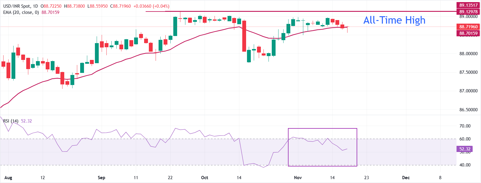 印度卢比(INR)在周三未能延续其对美元(USD)的连胜纪录,成为第四个交易日。美元/印度卢比(USD/INR)对早期损失进行了修复,回升至接近88.75,因为美元继续上涨。