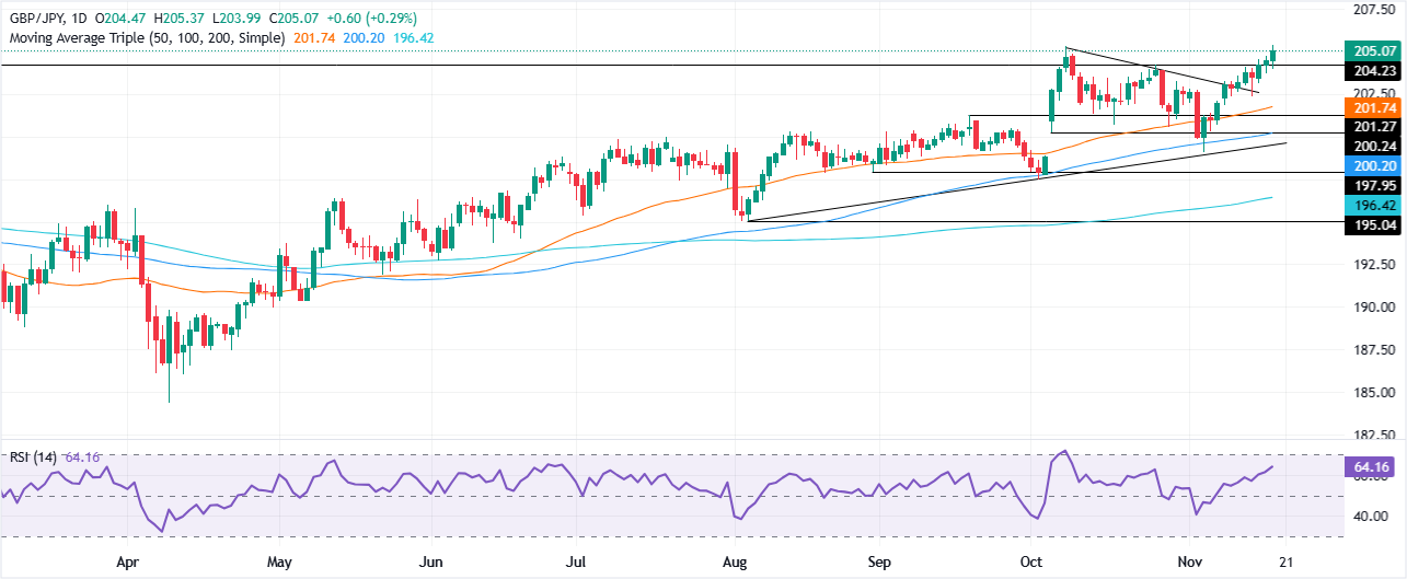 英镑/日元反弹至205.00以上,创下六周和年度新高,涨幅超过0.40%或80个点,因为日本央行行长植田和男与日本财政部长会晤。该交叉盘在周四亚洲时段开始时几乎没有变化,报205.07。
