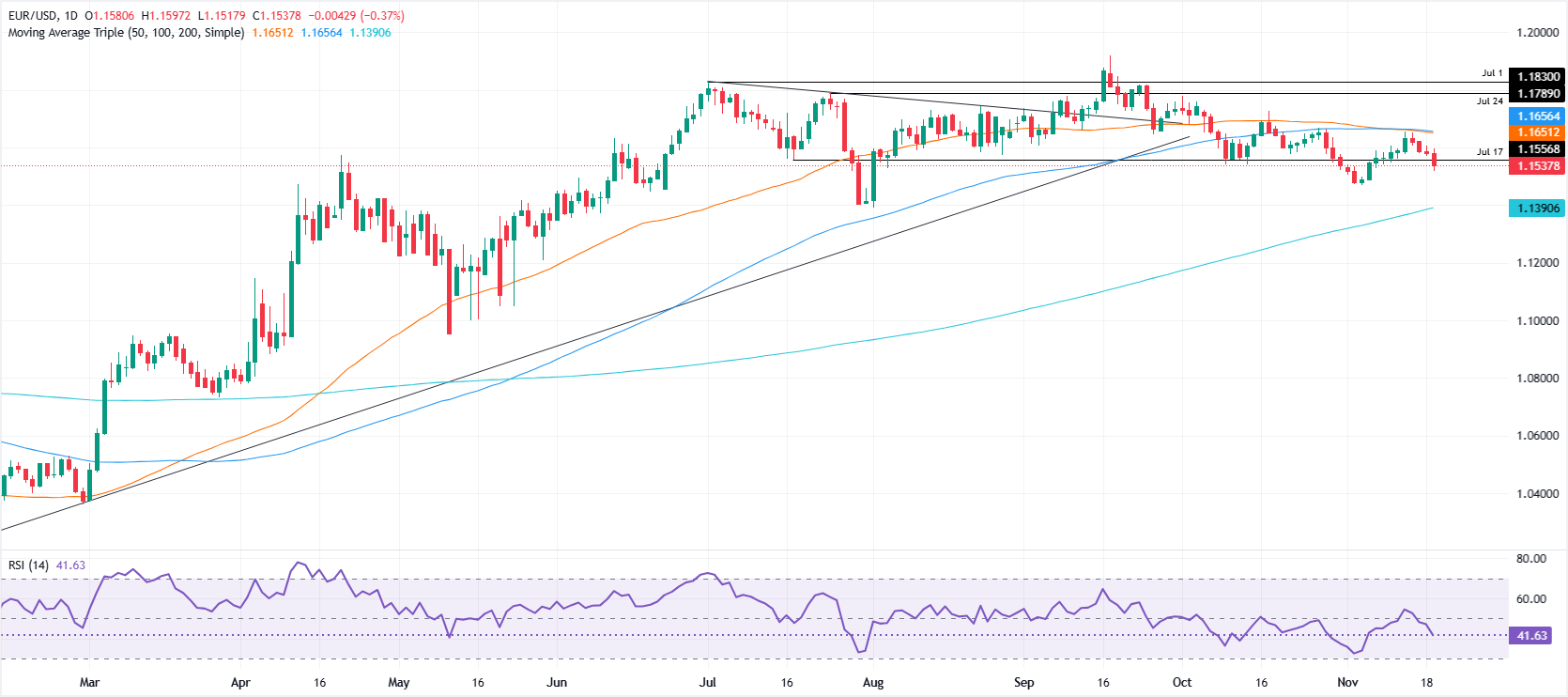 欧元/美元周三下跌超过0.49%,因美联储会议纪要暗示该央行可能在12月会议上跳过降息。该货币对交易于1.1524,曾触及接近1.1600的日低。