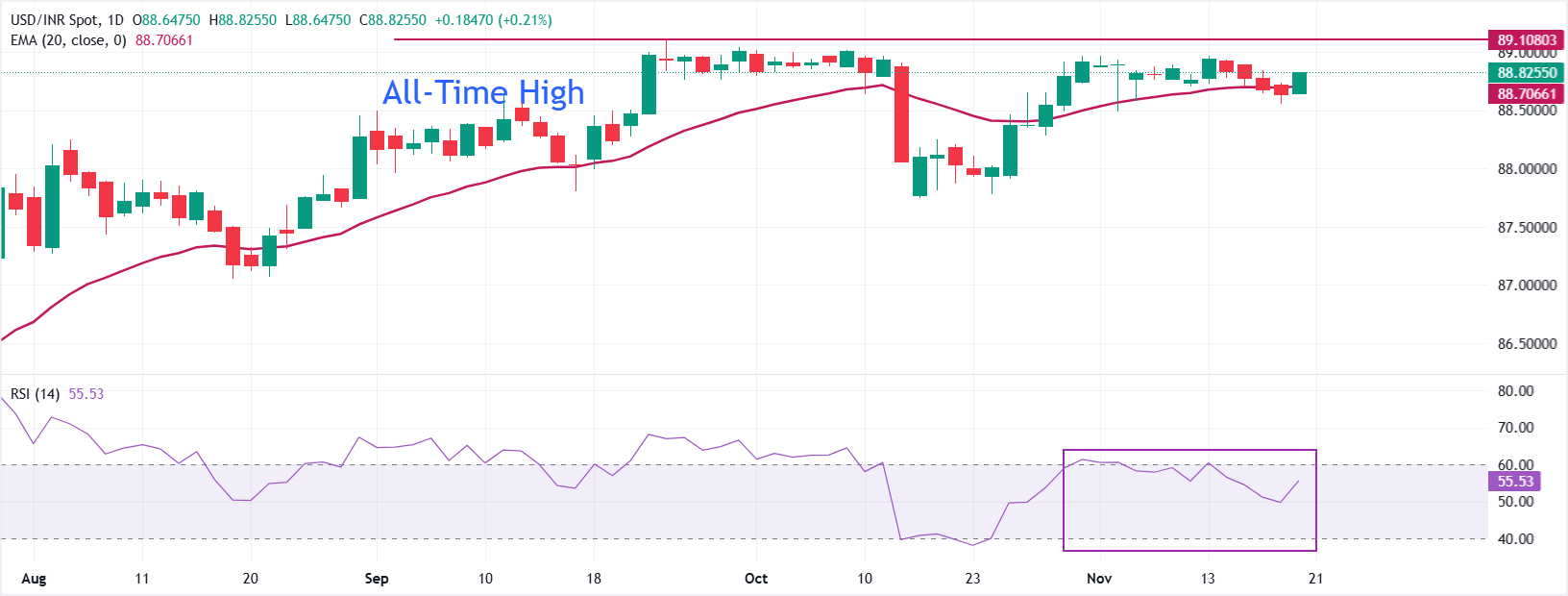 印度卢比(INR)周四对美元(USD)开盘走低。美元/印度卢比汇率因美元(USD)在周三公布的10月货币政策会议的联邦公开市场委员会(FOMC)会议纪要后表现优于其他货币,跳升至88.85附近。