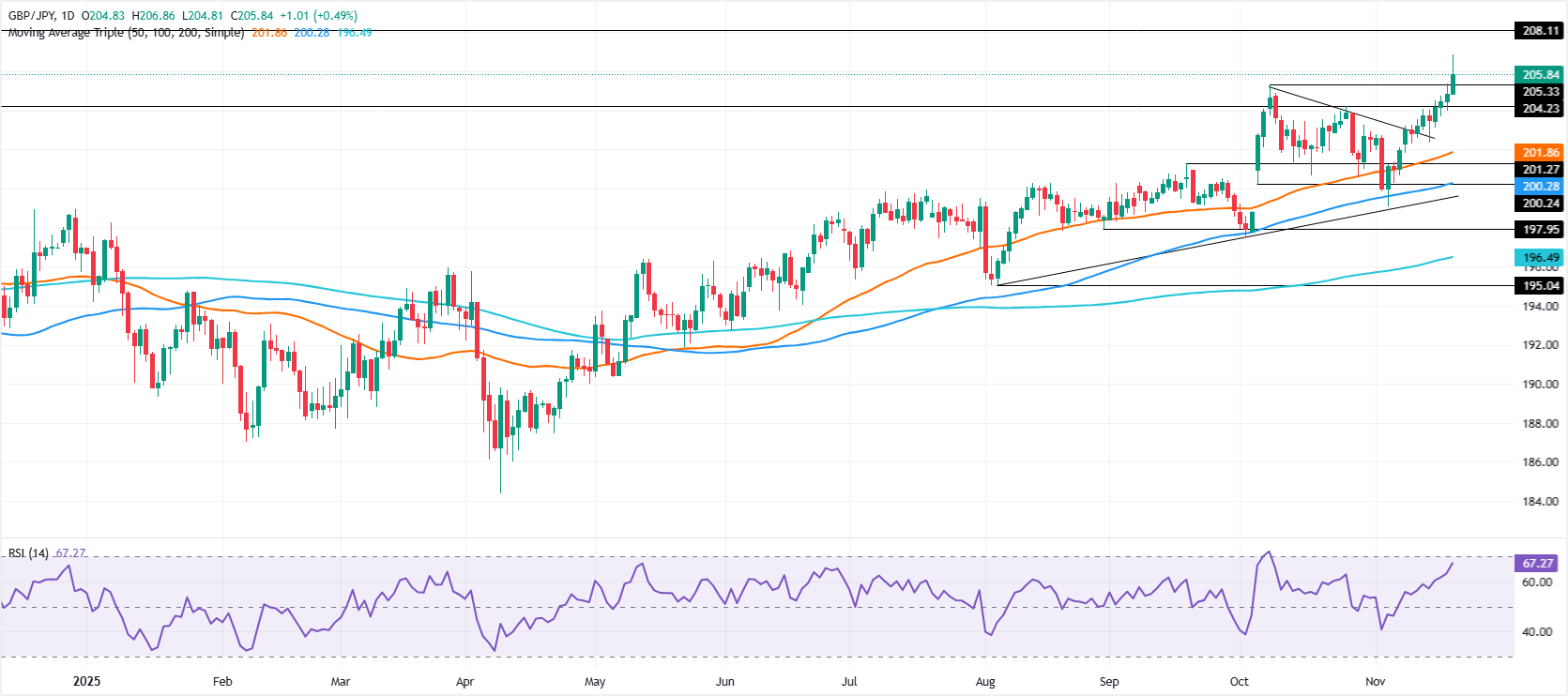英镑/日元连续第四天上涨,但在周四刷新年内高点 206.86 后,仍低于 206.00。撰写时,交叉货币对交易于 205.85,上涨 0.49%