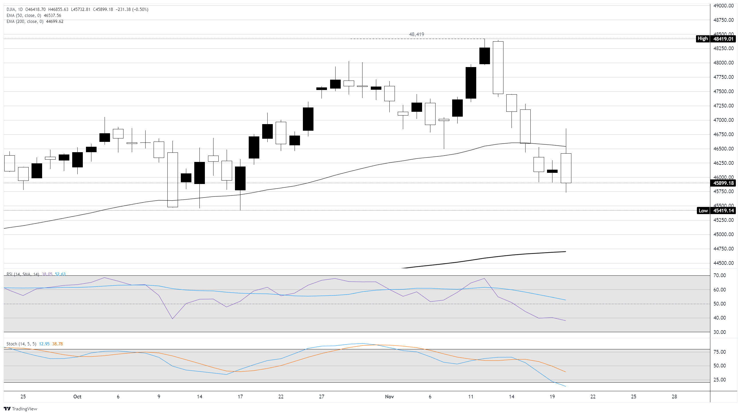道琼斯指数周四开盘表现强劲。主要股指在早盘上涨725点后,于GMT1545(东部时间1045)迅速反转,最高下跌超过1100点,期间触及五周低点45,732。