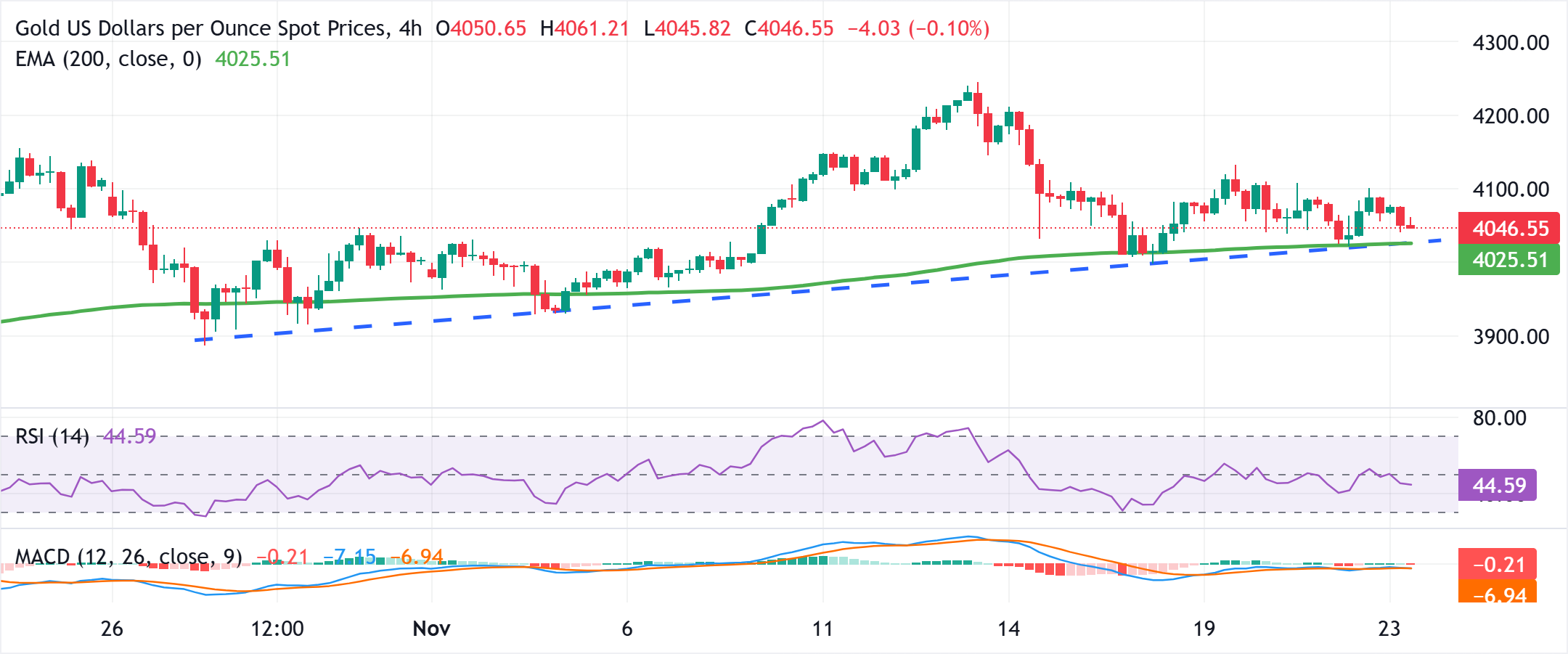 黄金(黄金/美元)从欧洲时段早期触及的日低小幅反弹,走势温和偏空,略高于 4060 美元水平,日内下跌不足 0.15%