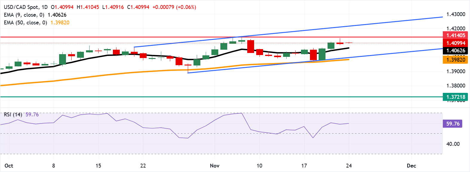 美元/加元在周一欧洲早盘时段恢复了前一交易日的近期损失,交易价格约为1.4100。日线图的技术形态反映出持续的看涨偏向,该货币对仍处于上升通道形态内。