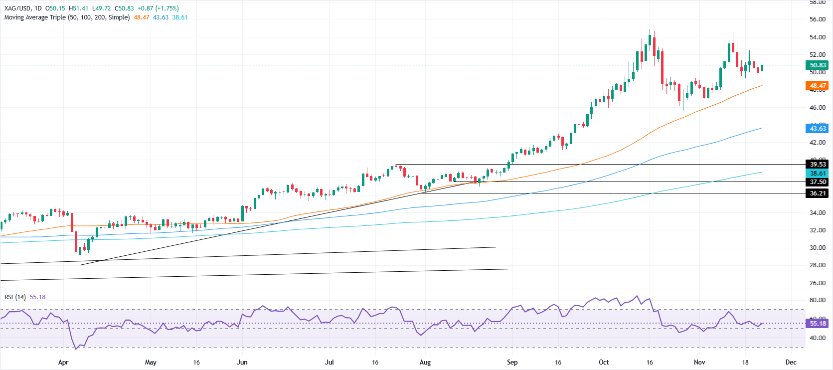 银价(白银/美元)在北美时段大幅反弹,涨幅超过2.50%,从日低49.73美元反弹,目前交投于51.37美元。