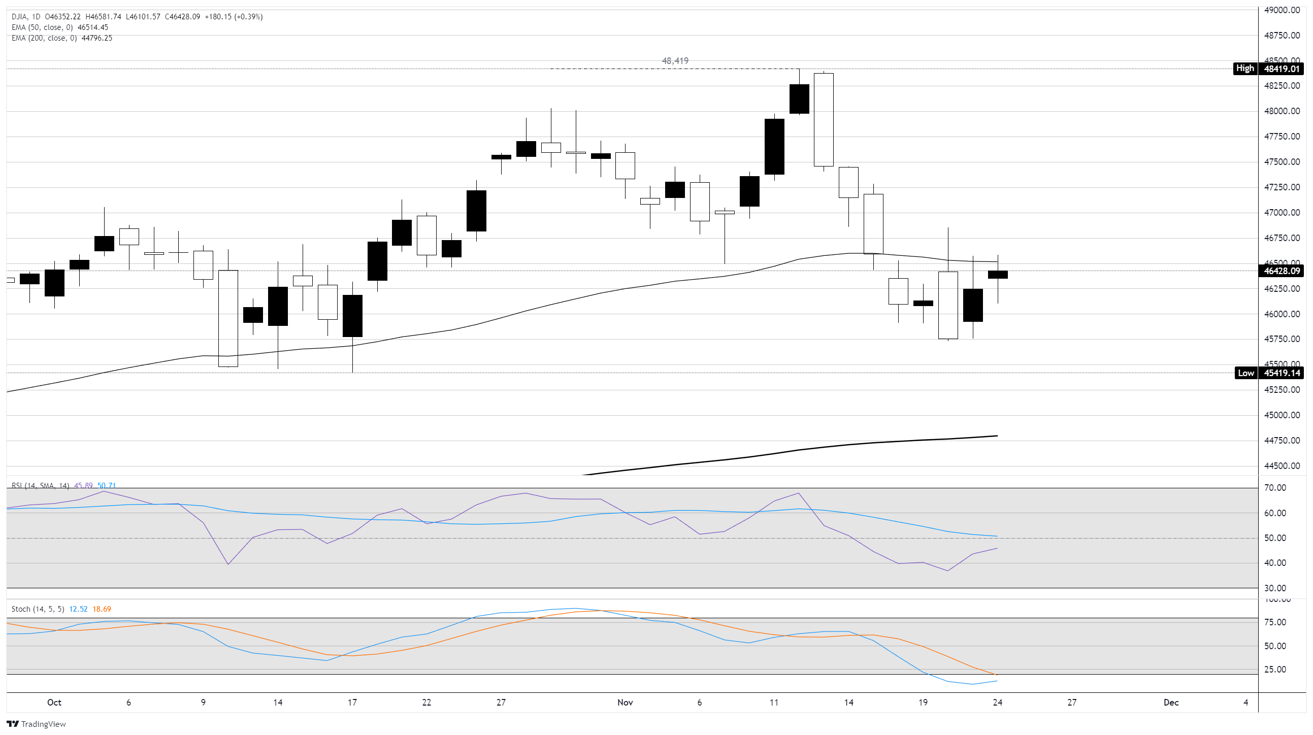 道琼斯工业平均指数(DJIA)在周一找到了一些上行空间,以200点的涨幅开启了一个假期缩短的交易周,再次测试46,500区域