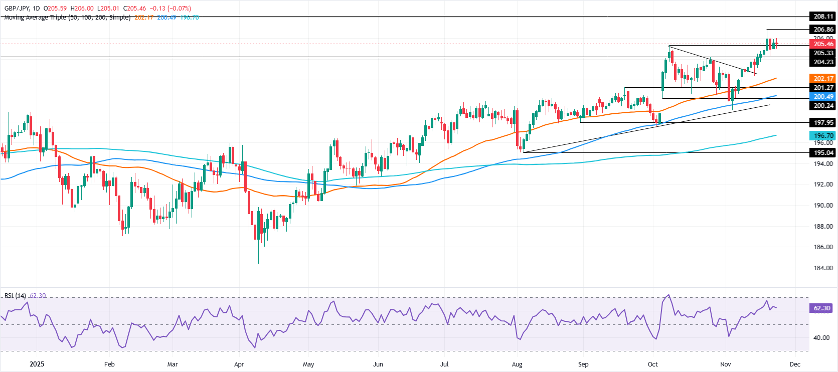 英镑/日元在周二的交易中进行盘整,因日元(JPY)因日本央行(BoJ)可能干预外汇市场的威胁而升值,同时英镑交易者在等待英国财政预算的发布。撰写时,该交叉盘交易于205.44,跌幅为0.08%。