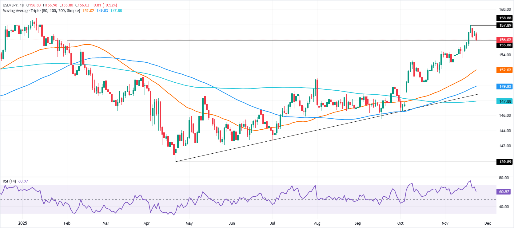 美元/日元在周二出现U型反转,跌幅超过0.54%,因投资者对美联储将在12月会议上降息的信心增强,此前美国通胀报告疲软,零售销售数据也低于预期。在撰写本文时,该货币对交易于155.98,首次跌破156.00大关,时隔四天。