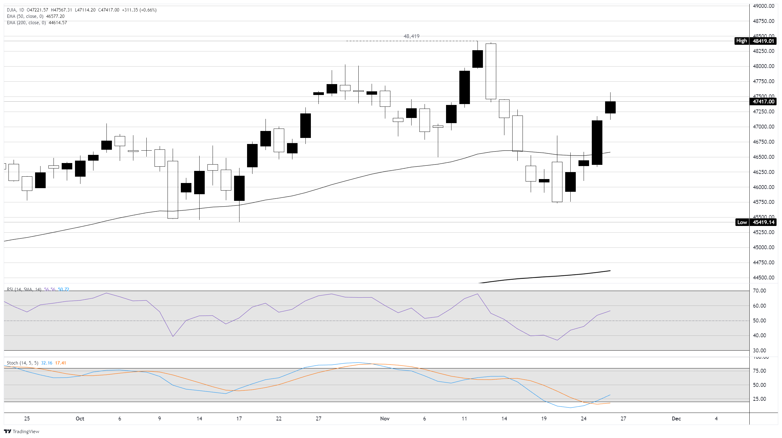 道琼斯工业平均指数(DJIA)周三再涨300点,收复近期跌幅,并重新测试47,500水平。主要股指已连续第四天上涨,随着更广泛的市场在美联储(Fed)即将进行的第三次连续降息预期下倾向于看涨。