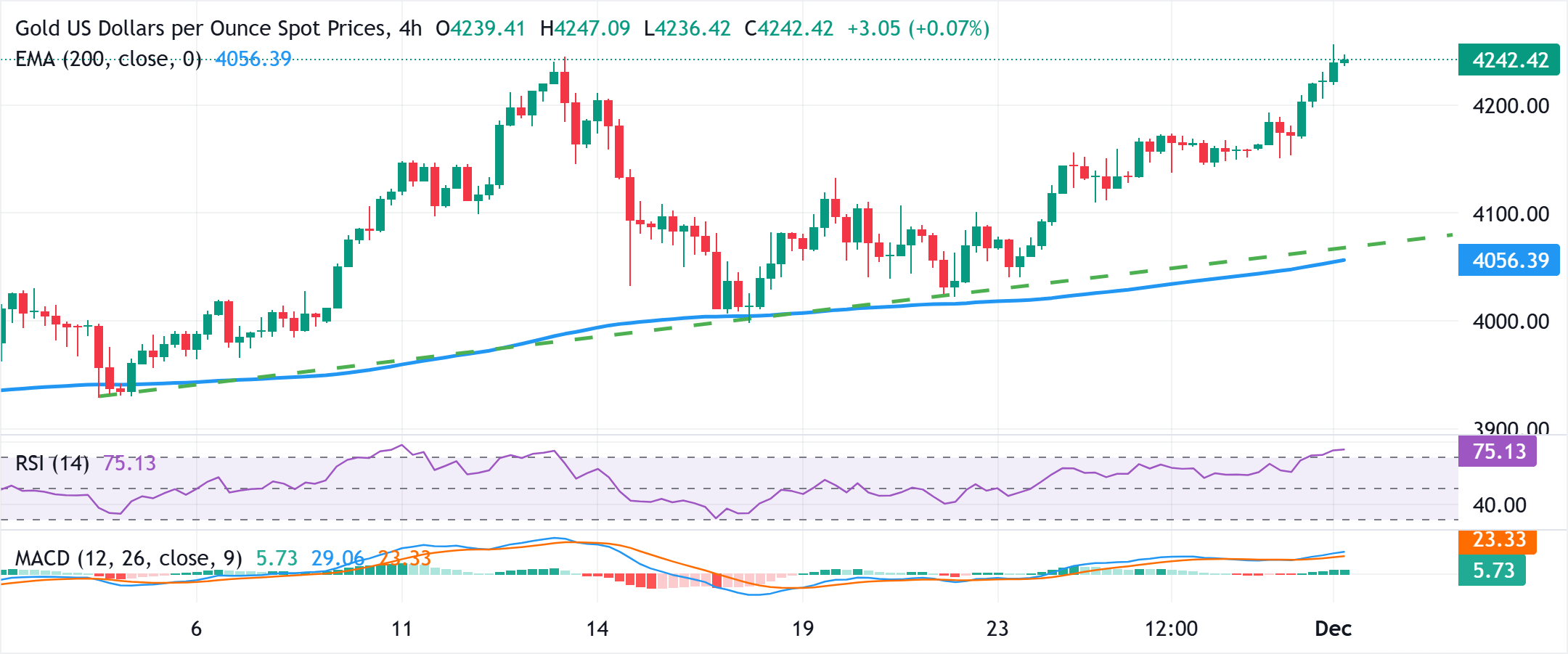 黄金(黄金/美元)在周一欧洲时段的前半段保持强势,目前交易接近自10月21日以来的最高水平。交易员们因几位美联储(Fed)官员最近的鸽派言论而加大了对美国央行再次降息的押注。鸽派前景反过来将美元(USD)拖至近两周低点,并继续支撑无收益的黄色金属。