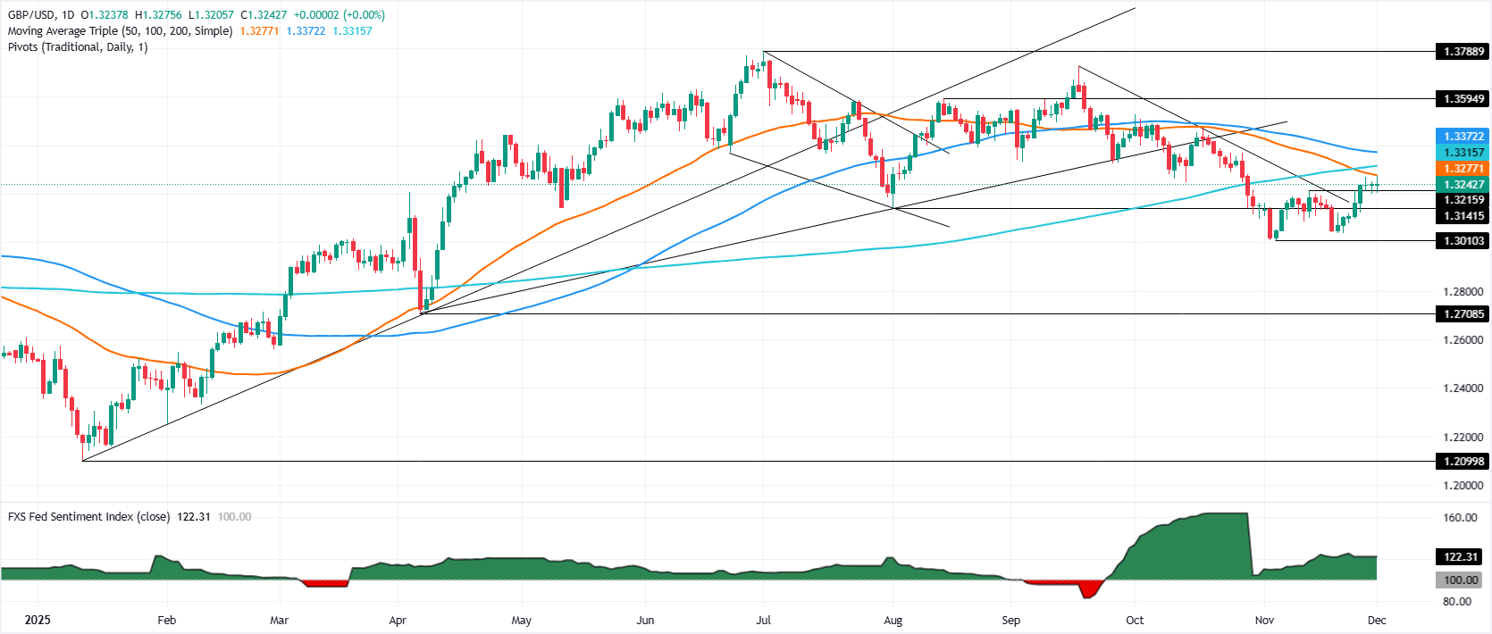 英镑/美元周一小幅上涨超过0.20%,投资者对美联储可能在下周会议上降息的信心增强,交易员们对白宫经济顾问凯文·哈塞特接替鲍威尔担任美联储主席的提名进行了定价。该货币对交易于1.3250,之前触及日低1.3205。