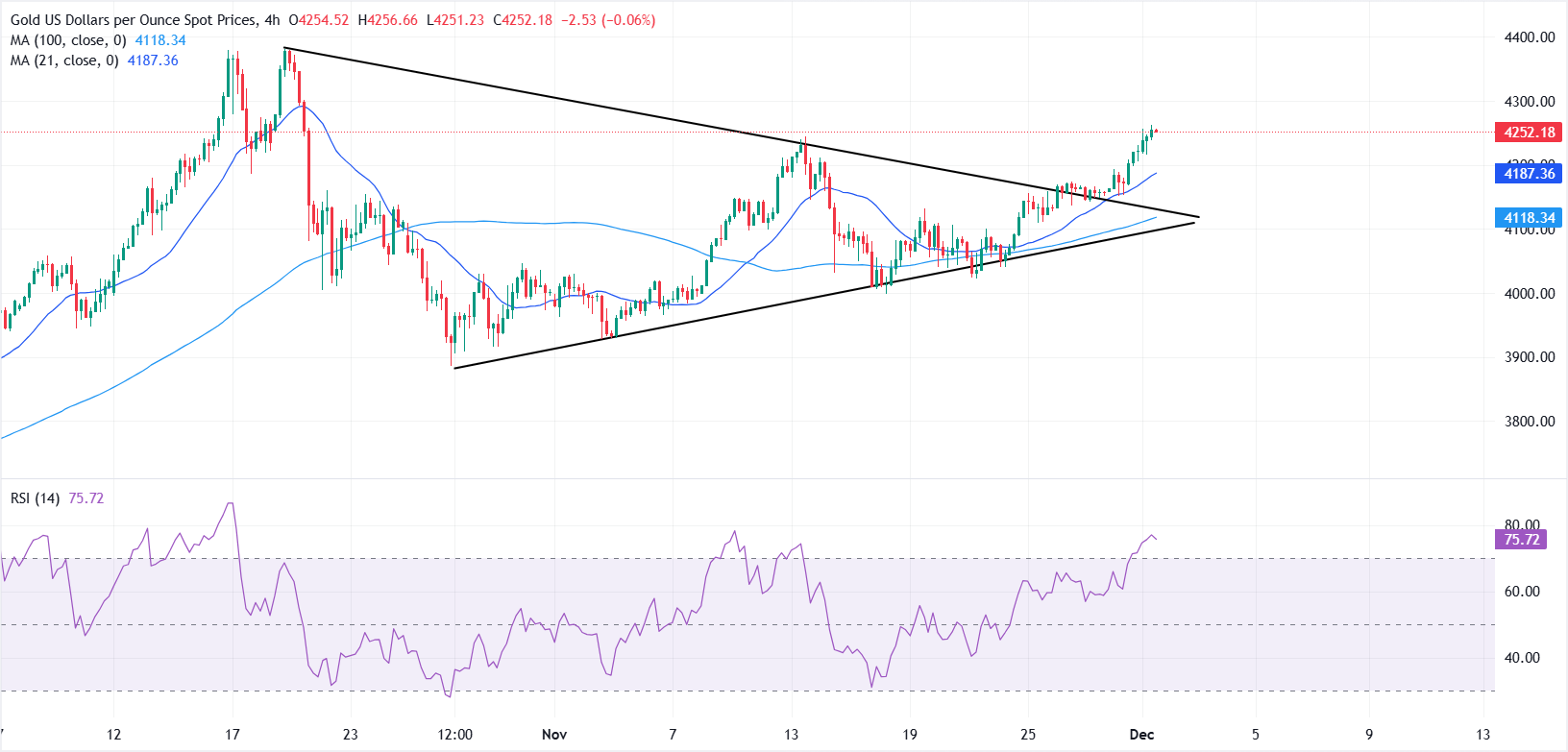 黄金(XAU/USD)在新月份开始时表现强劲,周一攀升至自10月21日以来的最高水平,因避险情绪支撑安全资产需求,同时交易者为美联储(Fed)在12月9-10日的货币政策会议上再次降息做好准备。