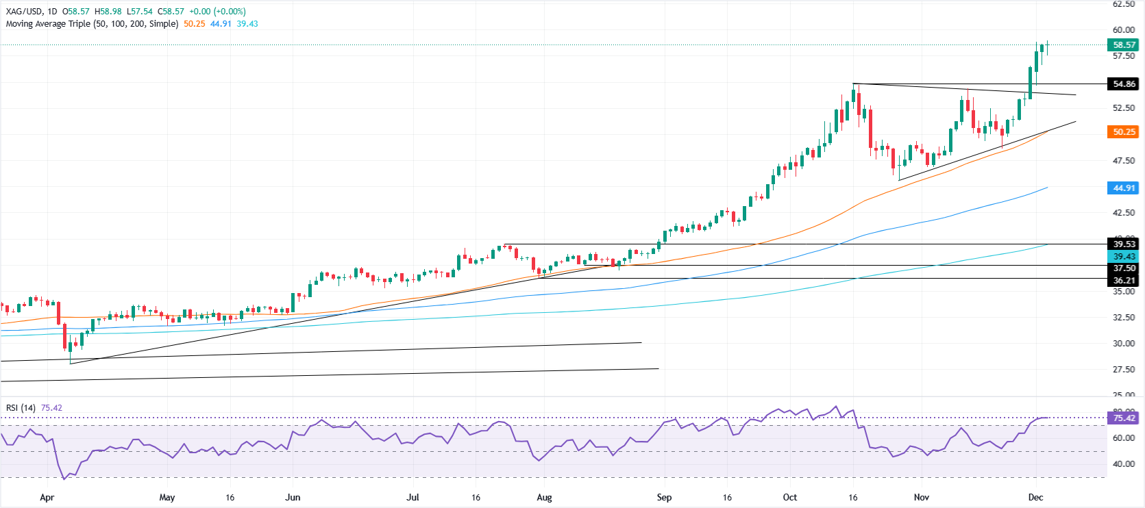 周三北美时段尾盘,银价回落,尽管美元走弱,但数据显示投资者意图美联储将在下周降息。截至发稿时,白银(XAG/USD)交易价格为58.49美元,跌幅为0.14%