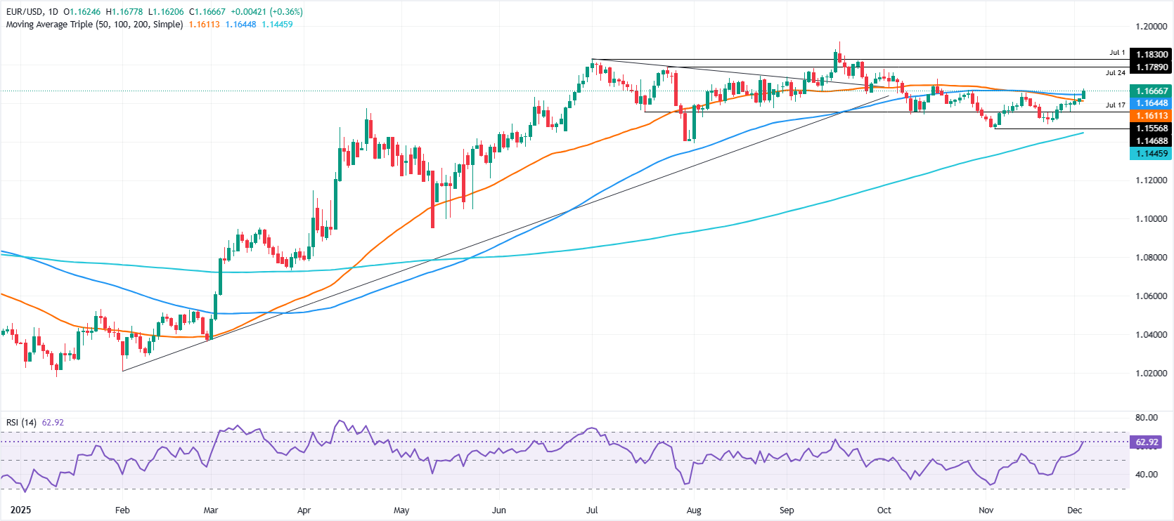 周三,欧元/美元在美国经济数据强化了市场对美联储将在12月9-10日会议上降息的押注后,飙升超过0.40%。该货币对在从日内低点1.1617反弹后,交易于1.1668。