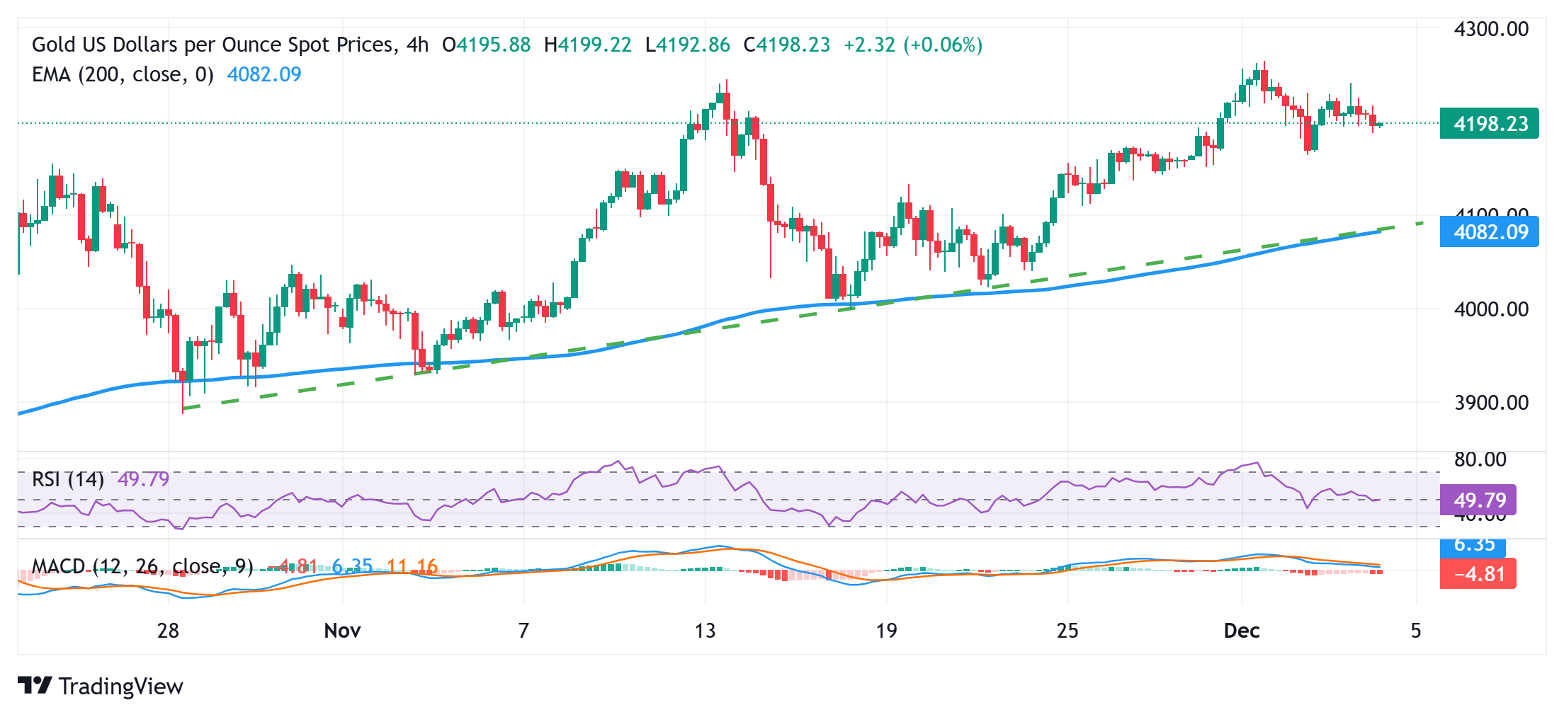 黄金(黄金/美元)略微从日低回升,但在周四欧洲时段的前半段仍保持在4200美元以下,因基本面信号混杂。股市普遍积极的情绪被视为对避险贵金属施加下行压力的关键因素。然而,源于持续的俄乌战争的地缘政治不确定性,以及美联储(Fed)鸽派预期,有助于限制该大宗商品的下行空间。