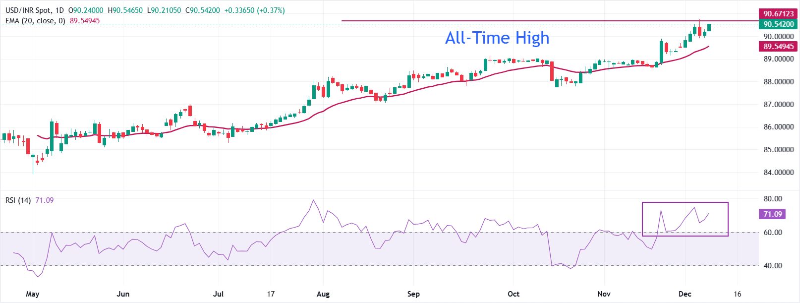 印度卢比(INR)在周初对美元(USD)走低。由于外国资金持续流出印度股市,以及印度储备银行(RBI)周五的鸽派货币政策声明,美元/印度卢比(USD/INR)跳升至接近90.50,印度卢比继续表现不佳。