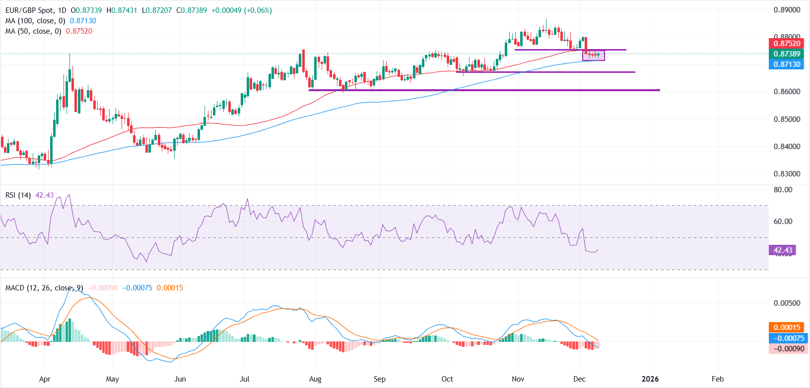 周二,欧元(EUR)对英镑(GBP)保持稳定,欧元/英镑在熟悉的区间内波动,交易者因缺乏新催化剂而保持观望,注意力逐渐转向下周的欧洲央行(ECB)和英国央行(BoE)货币政策会议。