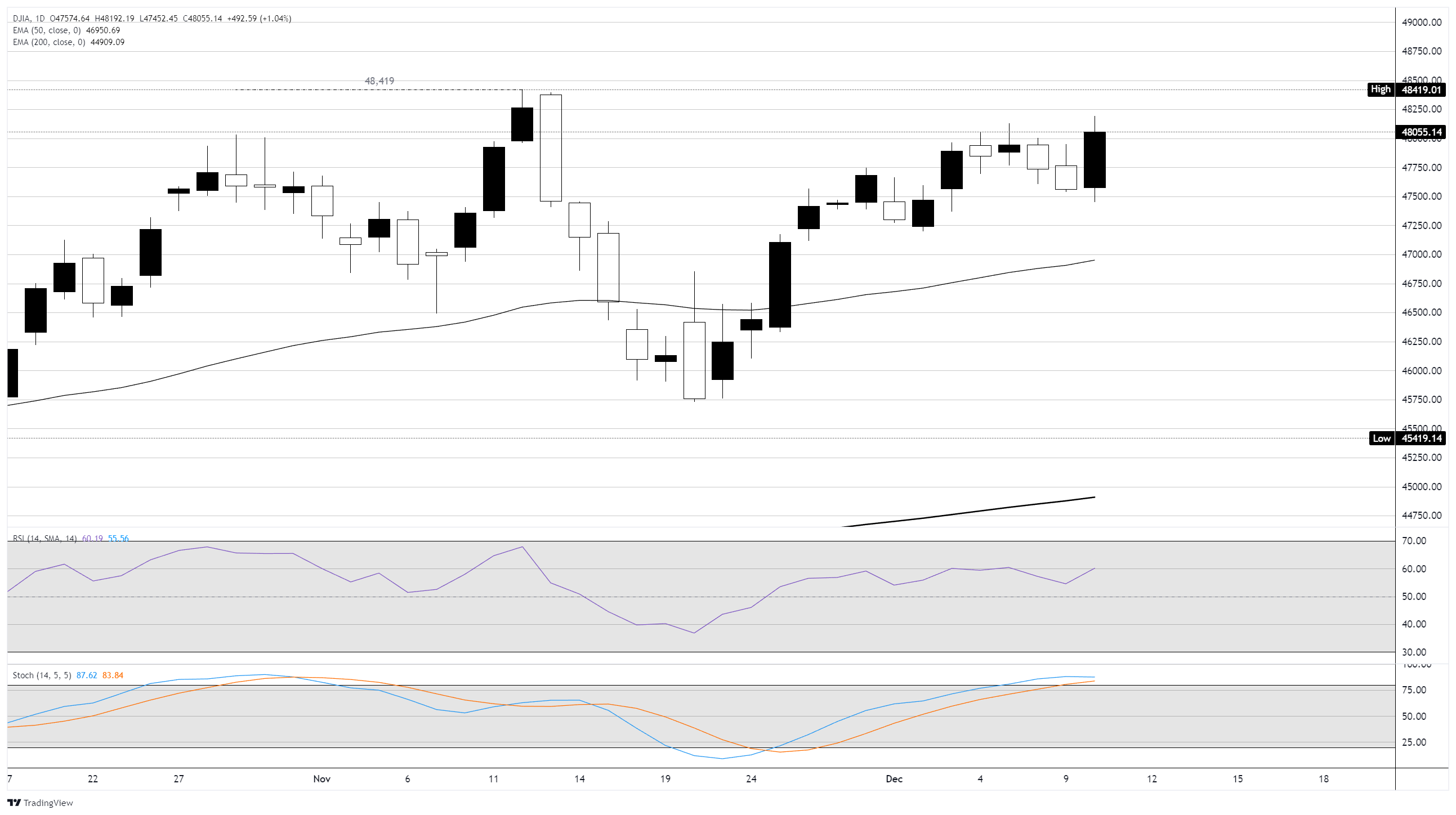 道琼斯工业平均指数(DJIA)在周三上涨,此前美联储(Fed)连续第三次将基准利率下调25个基点,最高时道琼斯上涨超过1.2%,并推动标普500指数上涨,而纳斯达克则维持在平盘附近。此次降息将联邦基金利率降低至3.50%–3.75%,并伴随重新启动短期债券购买,导致2年期国债收益率下降。市场解读美联储对劳动力市场放缓的认可为其可能优先支持就业的信号,即使通胀仍然是一个担忧。