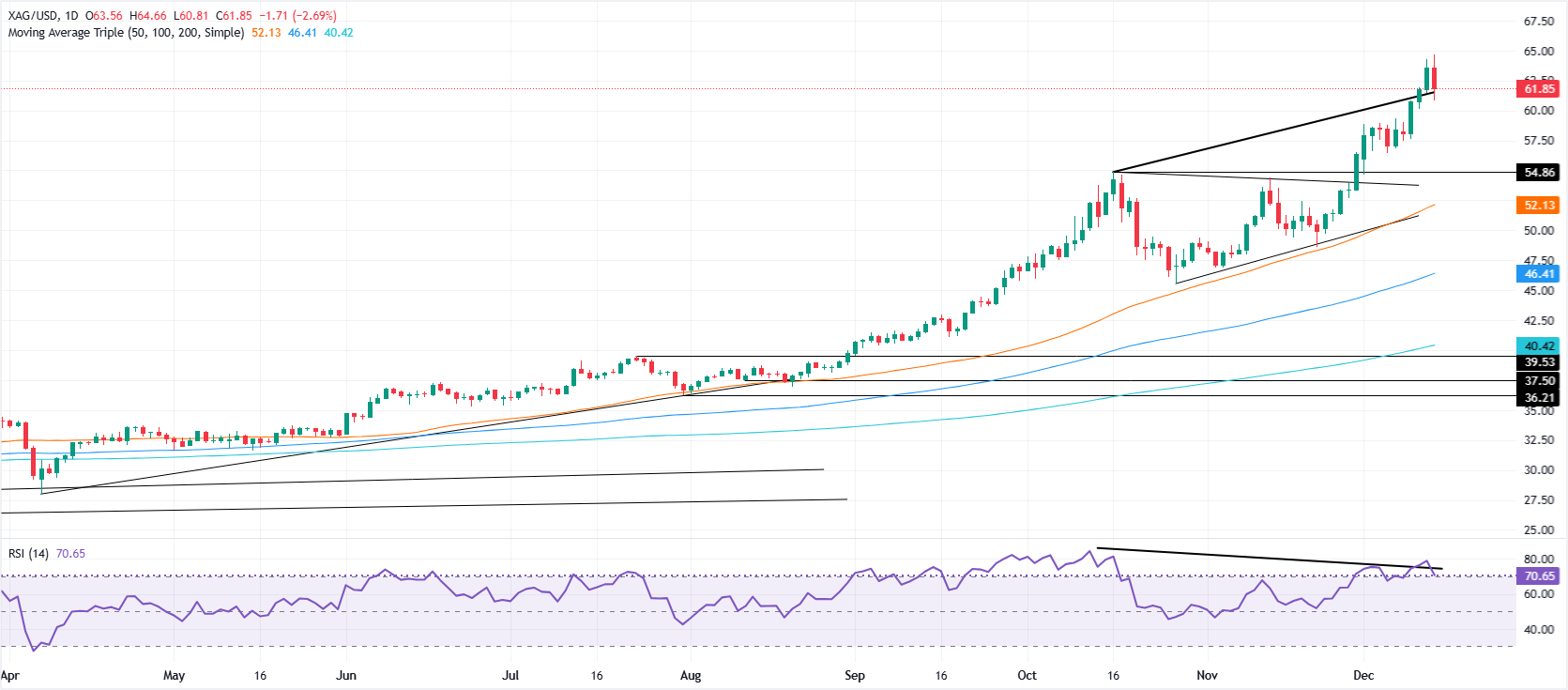 银价在触及历史最高点(ATH)64.65美元后暴跌,损失2.75%,投资者在周末前获利了结,而美联储官员对未来的货币政策会议意见不一。撰写时,XAG/USD交投于61.84美元。