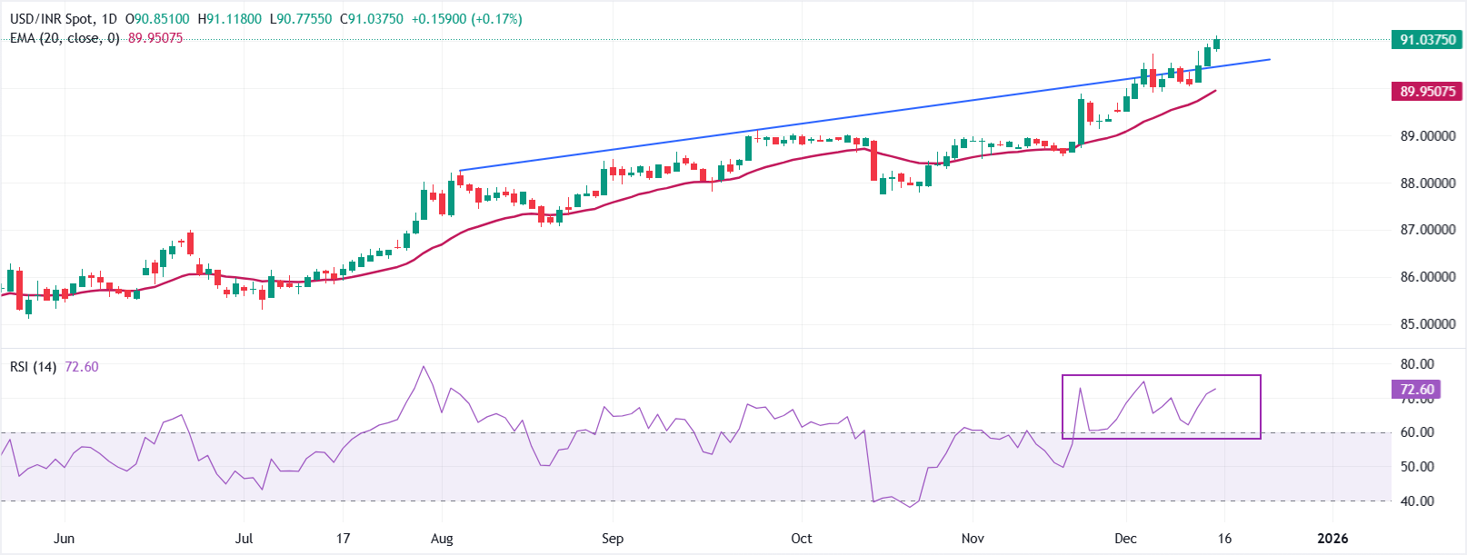 印度卢比(INR)在本周开始时对美元(USD)呈看跌走势,延续了第三个交易日的下跌趋势。美元/印度卢比对在91.10附近刷新历史高点,因美国与印度之间缺乏任何贸易协议公告,导致外国资金持续流出印度股市,持续打压印度卢比。