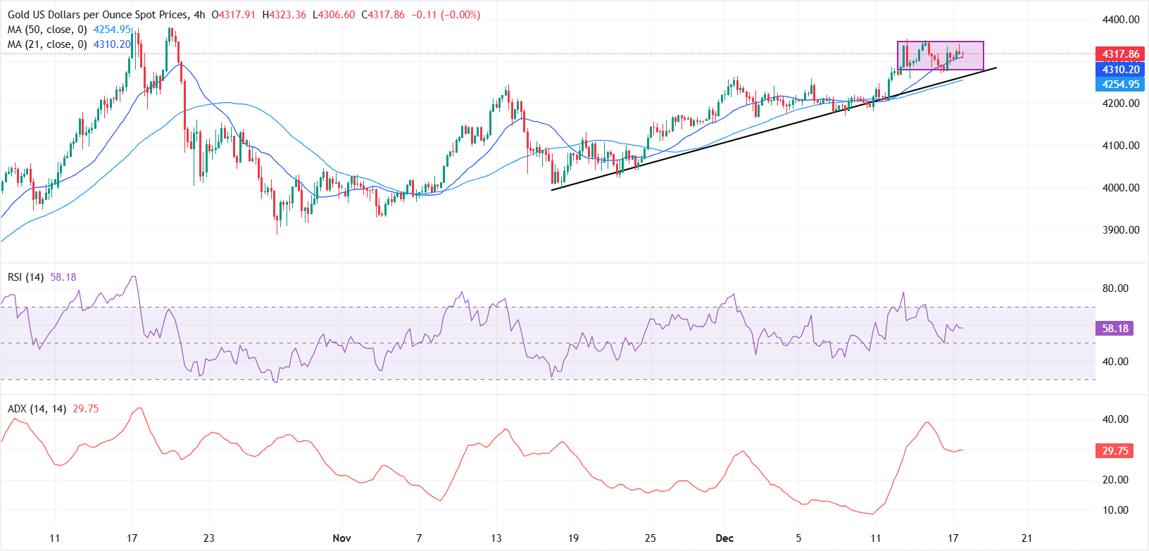 黄金(黄金/美元)周三走势略显积极,但由于美元(USD)反弹,涨幅难以扩大。截至撰写时,黄金/美元交易在4,315美元附近,稍微回落,早些时候在欧洲早盘短暂触及4,342美元。