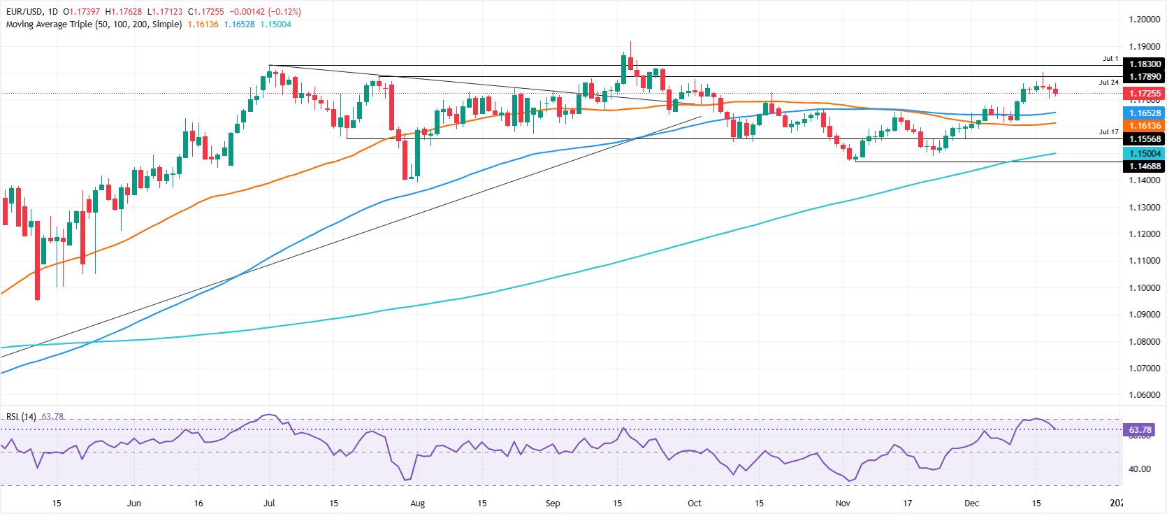 欧元/美元在周四回落,此前大西洋两岸的经济日程都很繁忙。美国的温和通胀数据以及欧洲央行(ECB)在今年最后一次会议上维持利率不变,几乎没有对单一货币产生影响