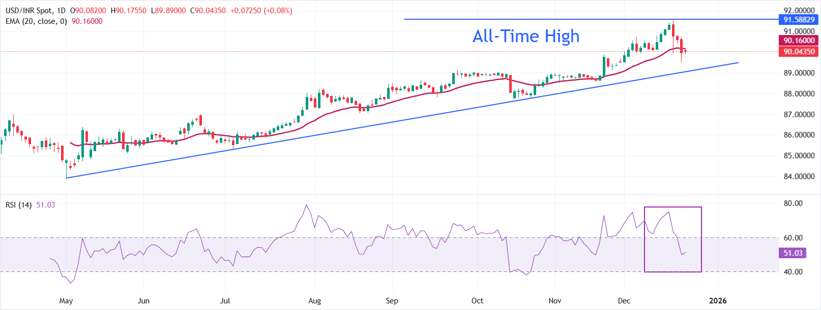 印度卢比(INR)在本周初继续保持上周对美元(USD)的涨幅。美元/印度卢比(USD/INR)在90.00附近徘徊,受到印度储备银行(RBI)在现货和不可交割远期(NDF)市场干预以支持印度卢比的推动。
