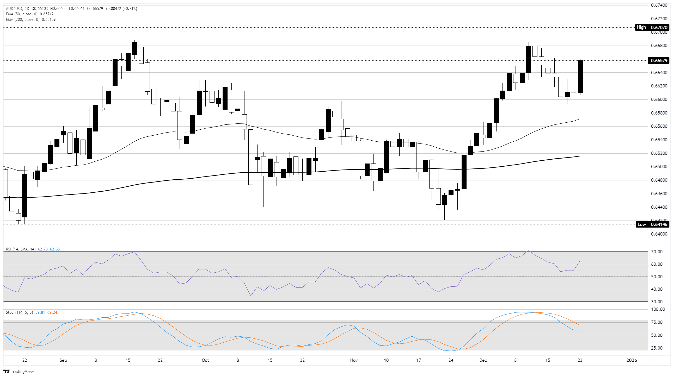 澳元/美元周一上涨,重新回到0.6660区域,此前经历了持续的短期下跌。澳元(AUD)获得了广泛市场美元(Greenback)流动的支持,避险美元(USD)在假期停业前出现回落。