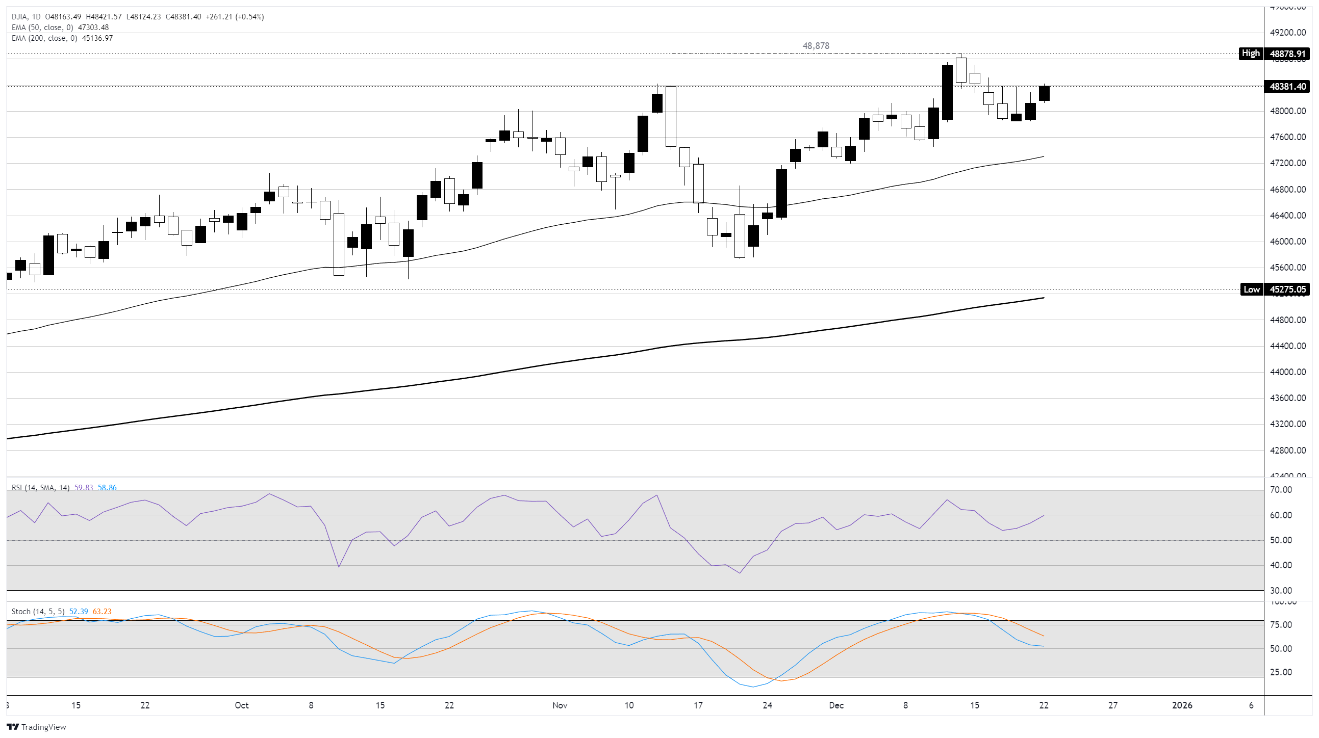 道琼斯工业平均指数(DJIA)在周一上涨,迎接圣诞假期的到来,股市倾向于看涨,以结束交易年度