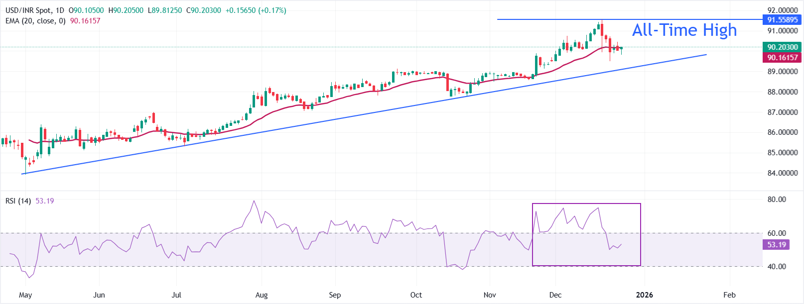 印度卢比(INR)在周三面临对美元(USD)的卖压。美元/印度卢比汇率回升至接近90.20,但在印度储备银行(RBI)上周干预后,整体处于修正阶段